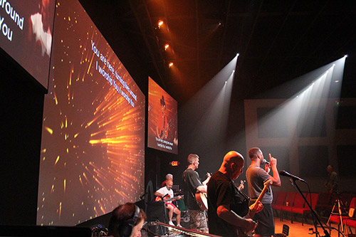 Our Sunday service begins at 10:15am. During our service, you’ll hear some energetic live music led by our worship band. You’ll see drums, electric guitars, keyboards, etc. The lyrics to all of our worship songs are up on the big screen in case you want to sing along.