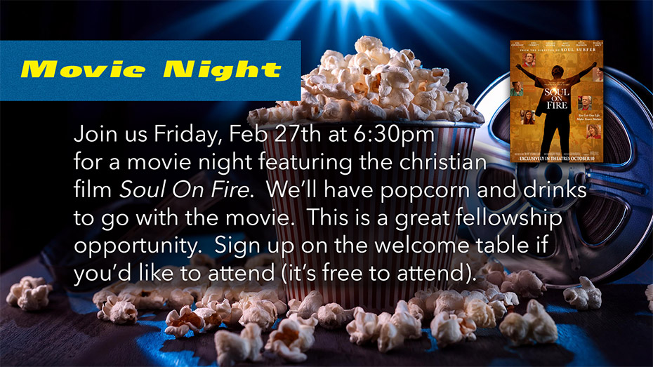 Join us on Friday, Feb. 27th for a free movie night featuring the Christian film "Soul On Fire". This is a free event and we'll have popcorn, drinks and other snacks available. This is a great opportunity for fellowship and encouragement. We can't wait to see you then!